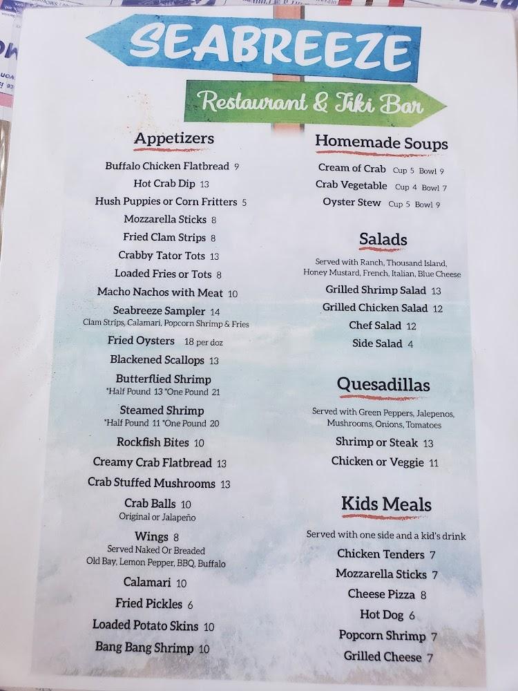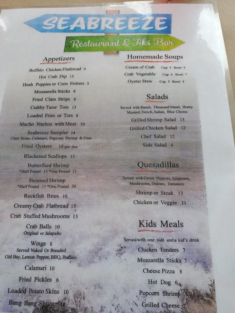 The drink menu complements the food selection, featuring local beers and expertly crafted cocktails. There's something for everyone, from fruity frozen drinks to choose from. Seabreeze's commitment to quality and community makes it a must-visit culinary destination.